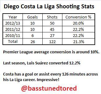 Carilah alternatif lain dengan jumlah 20juta itu. Ramai lagi diluar sana pemain yang lebih bersopan dan mantap walaupun muka mereka hitam legam macam Bilal Bin Rabbah.Dan saya harap bidaan pemain ini sekadar hangat-hangat taik ayam, sebab menurut pihak Atletico Madrid mereka belum terima bidaan rasmi. Yang tak rasmi mungkin disebabkan ejen Costa yang membuat spekulasi dek kerana kliennya dah panas pungkur tiada tempat dalam kesebelasan utama dengan kedatangan David Villa dari Barcelona. Lagipun tak berbaloi dengan harga jika tengok statistik dibawah.